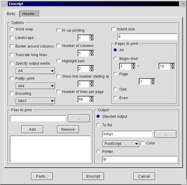 The image is a thumbnail of the enscript dialog. You can click on it for a larger view.